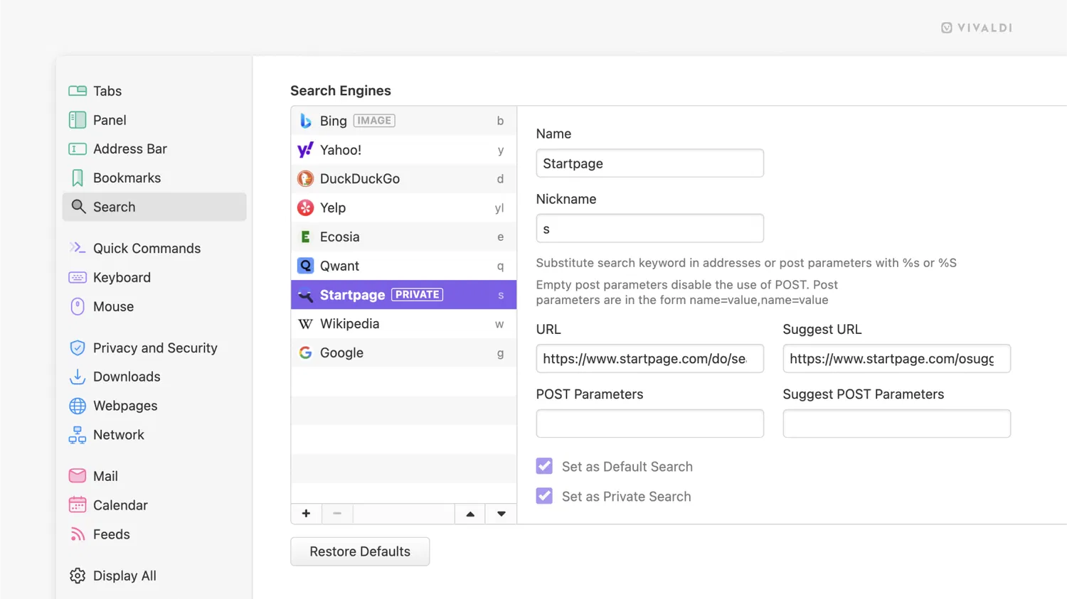 Для поддержания независимости Vivaldi изменили список поисковых систем, используемых по умолчанию. В их числе теперь Startpage, Ecosia, DuckDuckGo и Qwant. Эти изменения также включают обновления системы атрибуции рекламы, что позволяет поддерживать разработку браузера, при этом не собирая данные пользователей и не отслеживая их.