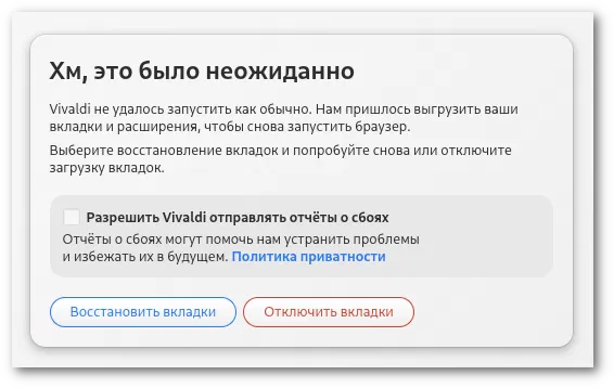 В новой версии реализован механизм предотвращения краш-циклов. Если открытая вкладка приводит к сбою браузера, Vivaldi предложит перезапустить браузер без её восстановления. Это позволяет избежать повторных сбоев и продолжить работу с остальными вкладками.