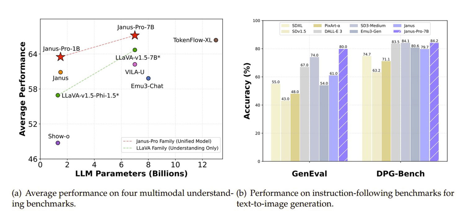 Китайский стартап DeepSeek выпустил новые мультимодальные модели Janus Pro, которые могут анализировать изображения и создавать новые. По словам компании, в тестах GenEval и DPG-Bench модель Janus-Pro-7B превосходит такие решения, как Stable Diffusion 3 Medium и DALL-E 3 от OpenAI.