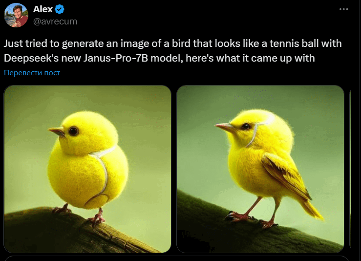 «Только что попробовал сгенерировать изображение птички, которая выглядит как теннисный мяч, с помощью новой Janus-Pro-7B, вот что получилось», — @avrecum