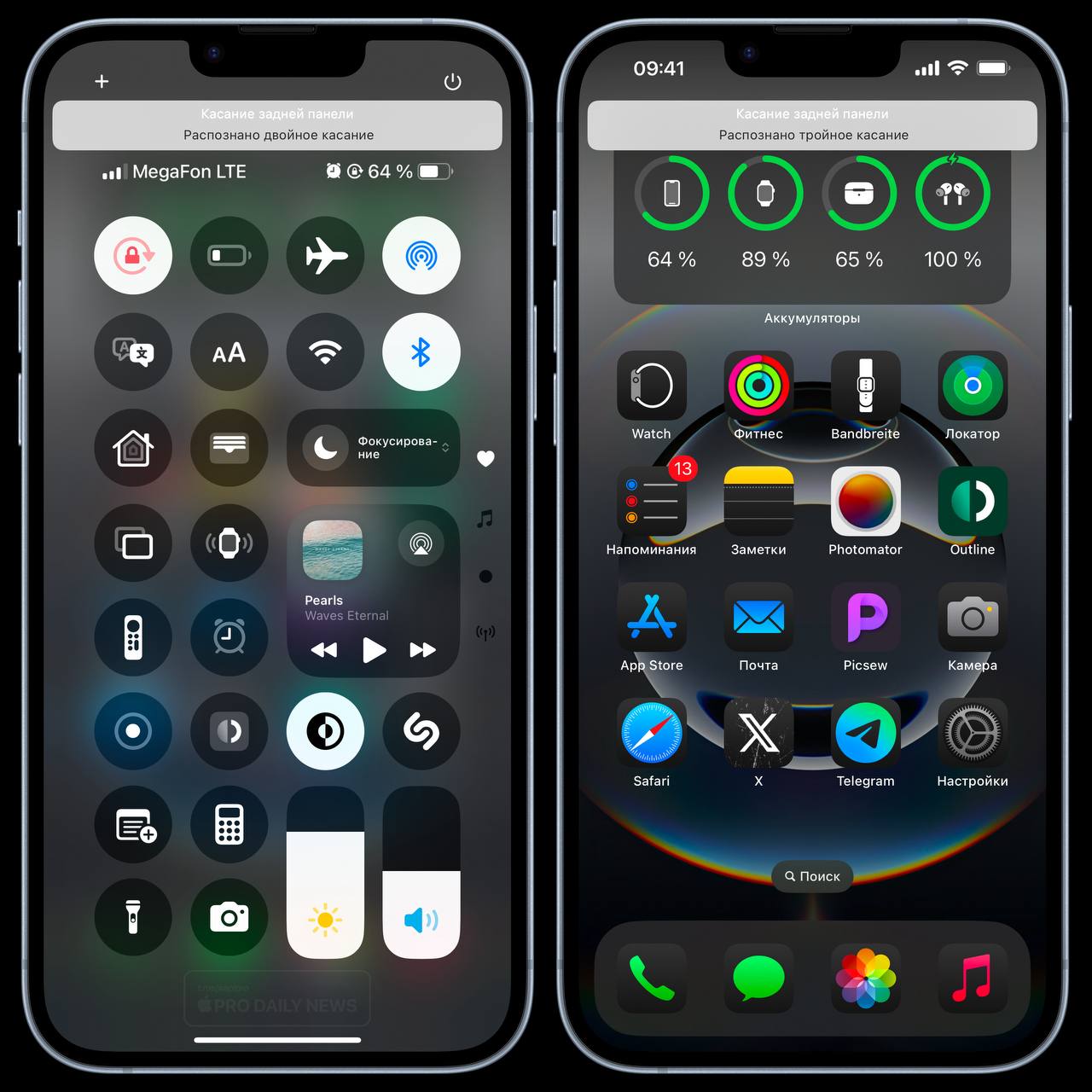 - Касание – добавлен баннер при распознавании двойного или тройного касания задней панели.