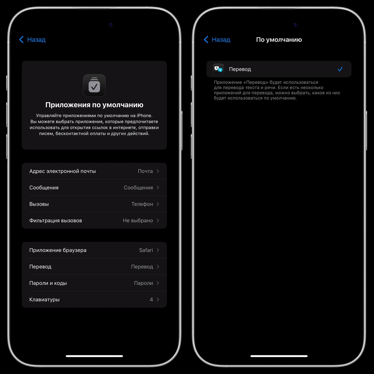 - Приложения по умолчанию – теперь можно выбрать приложение для перевода текста и речи. Пока доступно только стандартное приложение «Перевод».