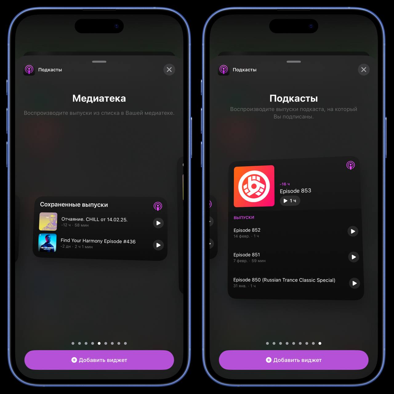 - Подкасты – добавлено два новых типа виджетов в трёх размерах: сохранённые выпуски и эпизоды подписанных подкастов.
