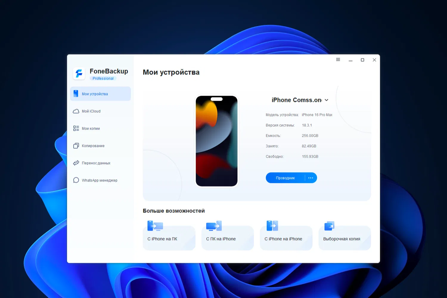 • Резервное копирование iPhone – создавайте полные или выборочные резервные копии данных на компьютере или внешних носителях (HDD, SSD, NAS).