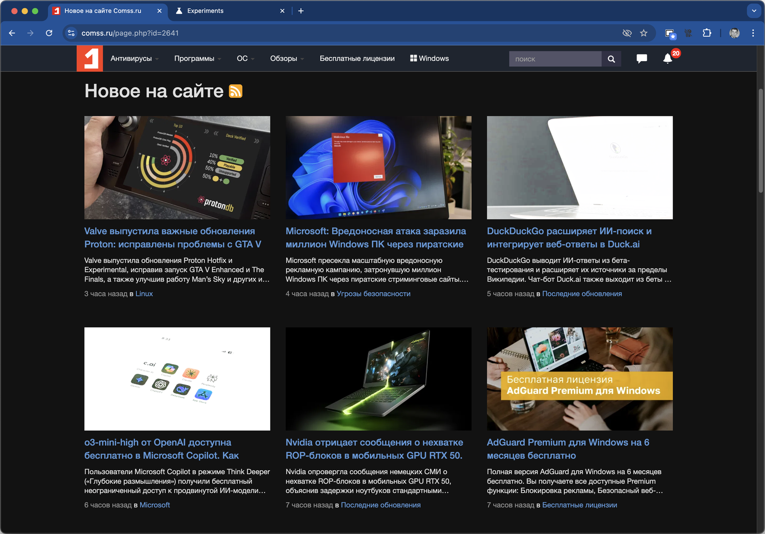 • После перезапуска все сайты, не имеющие встроенного тёмного режима, автоматически будут отображаться в тёмной теме.