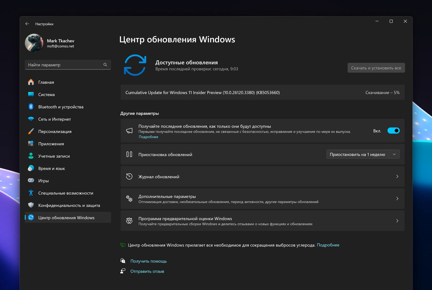 Перейдите в меню Параметры > Центр обновления Windows и нажмите Проверить наличие обновлений. Для завершения установки потребуется перезагрузка компьютера.