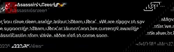 Многие из вас спрашивали про Steam Deck. Мы рады сообщить, что Assassin’s Creed Shadows будет поддерживаться на этом устройстве с момента выхода. Сейчас мы ждём окончательной оценки от Valve. Скоро расскажем подробности.