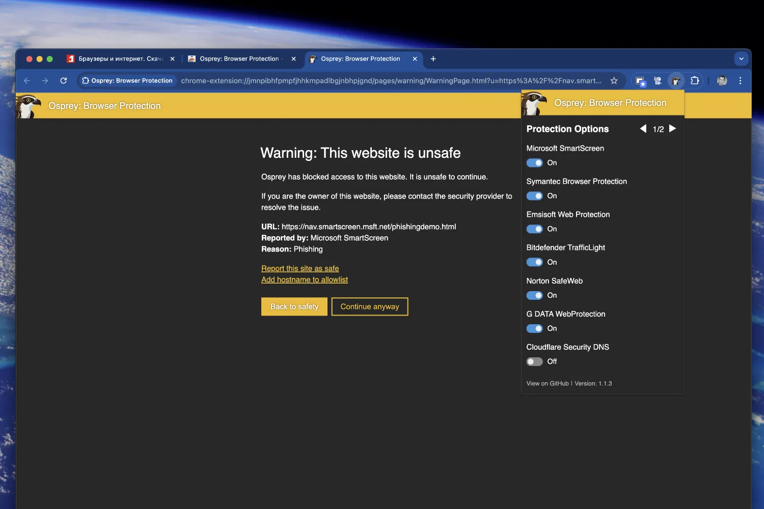 Osprey: Browser Protection — это бесплатное расширение для браузеров Google Chrome, Microsoft Edge и Firefox, обеспечивающее защиту от вредоносных сайтов, фишинга, мошенничества и других интернет-угроз в реальном времени. Решение объединяет возможности нескольких движков защиты и ориентировано на максимальную безопасность при работе в интернете.