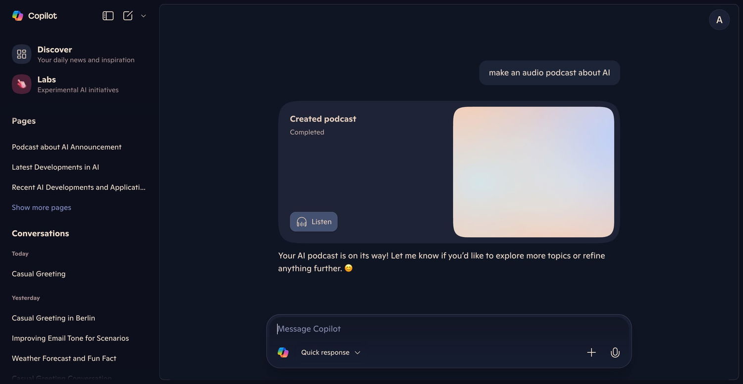 В Microsoft Copilot появилась новая функция — генерация подкастов, позволяющая помощнику превращать практически любую тему или предоставленные пользователем материалы в короткое, разговорное шоу. Инструмент создает диалог между двумя синтетическими ведущими — формат, очень похожий на «Audio Overview», представленный Google в прошлом году. Это делает прослушивание более живым и динамичным по сравнению с монотонным рассказом одного диктора.