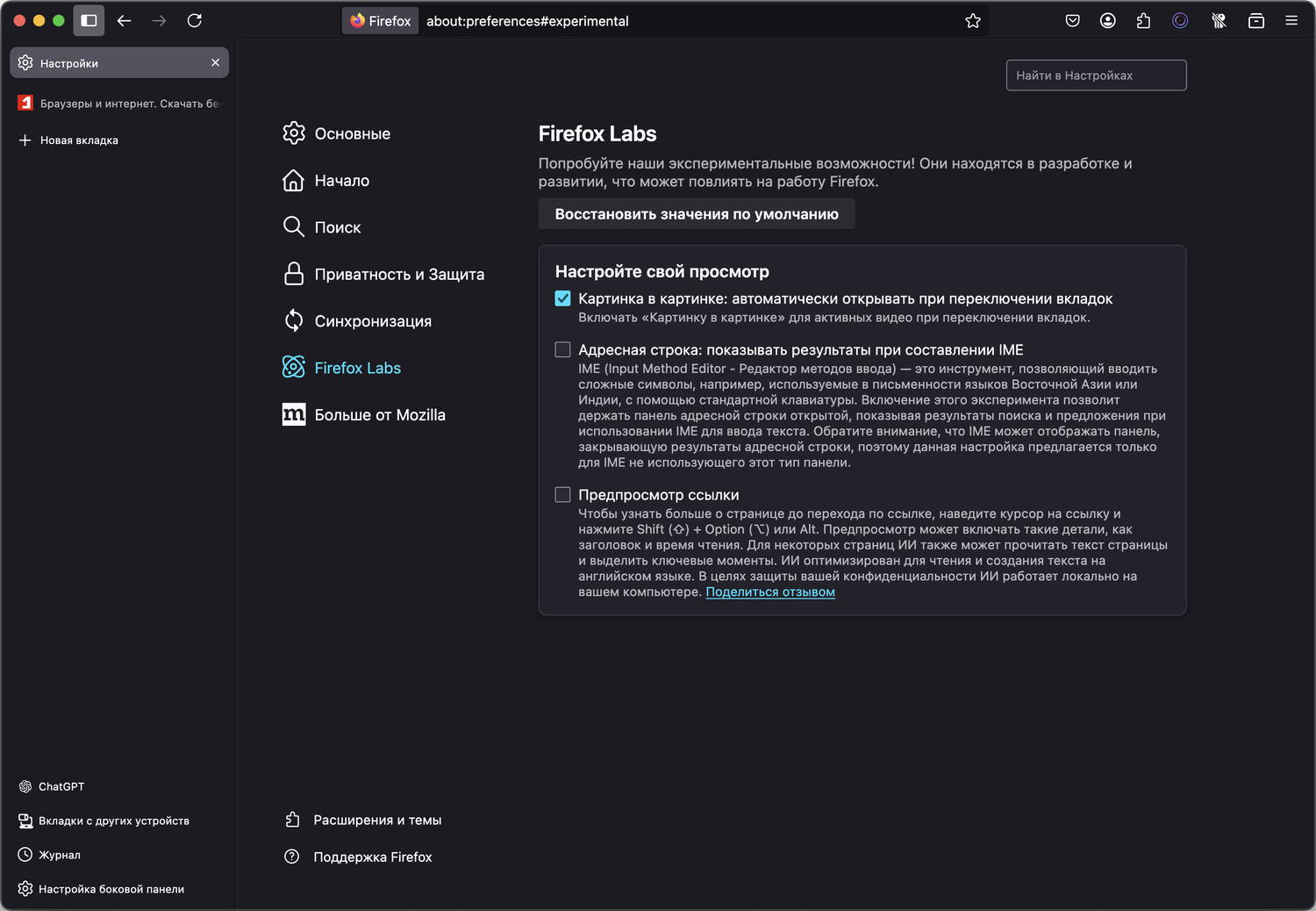 • Расширение возможностей Firefox Labs — пользователи снова могут тестировать экспериментальные функции, например автоматическое включение режима «Картинка в картинке» при переключении вкладок с активным видео.
