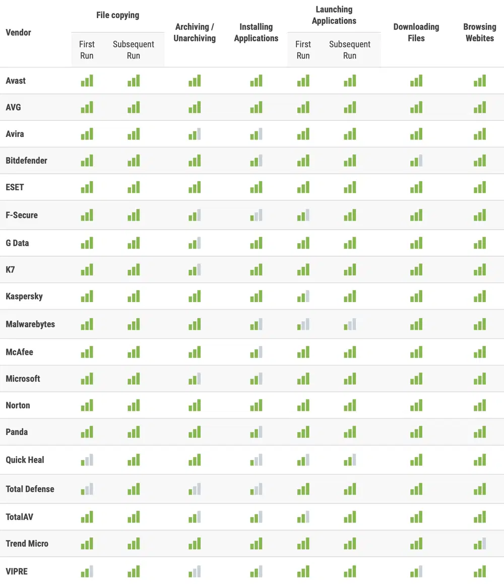 Худшие результаты показали Bitdefender, Total Defense и VIPRE, с заметным снижением быстродействия: до 35.5% общего влияния на систему. Их стоит рассматривать только для производительных ПК.