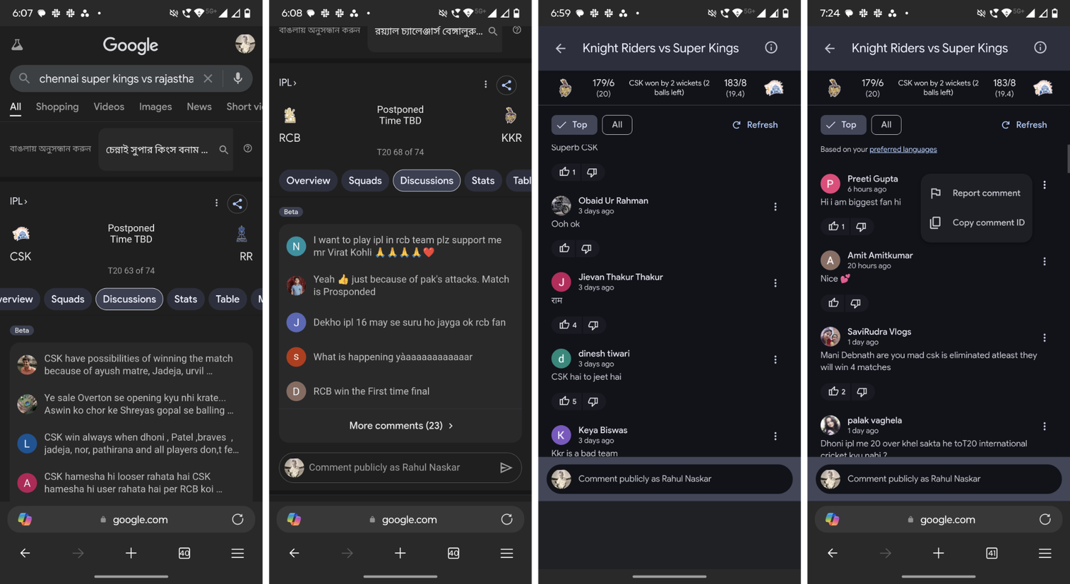Как и ожидалось, панель обсуждения позволяет любому человеку с учетной записью Google общаться с другими и делиться своим мнением об этом матче. При добавлении комментария отображается аватар (или первая буква имени, если фото профиля нет). Полное имя видно другим участникам обсуждения только после нажатия на кнопку «Больше комментариев».