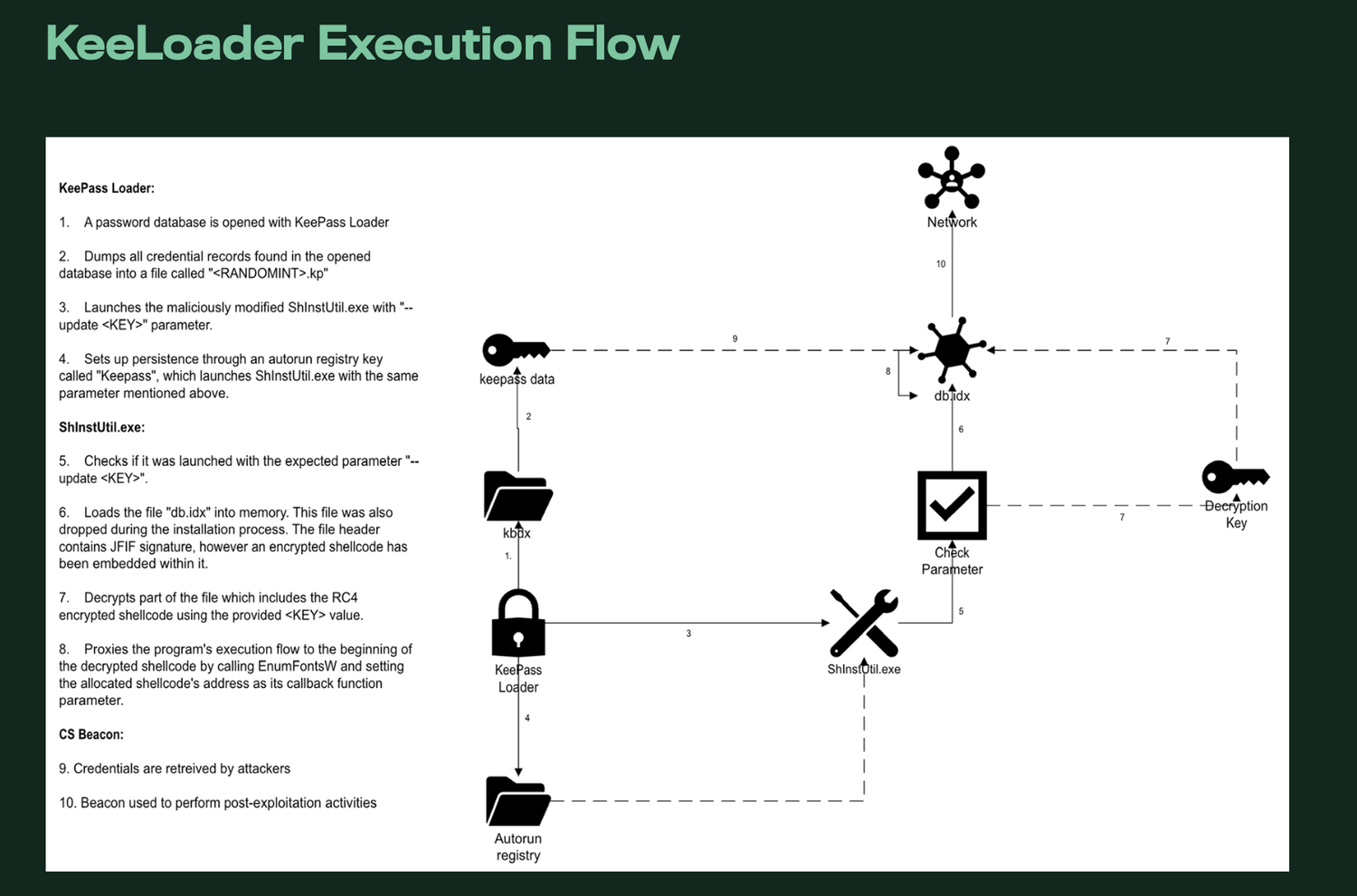 Поскольку KeePass является проектом с открытым исходным кодом, злоумышленники изменили его код и собрали версию с трояном под названием KeeLoader. Она полностью повторяет функциональность обычного KeePass, но включает в себя вредоносные дополнения — установку маяка Cobalt Strike и экспорт базы данных KeePass в открытом виде, который затем передается атакующим.