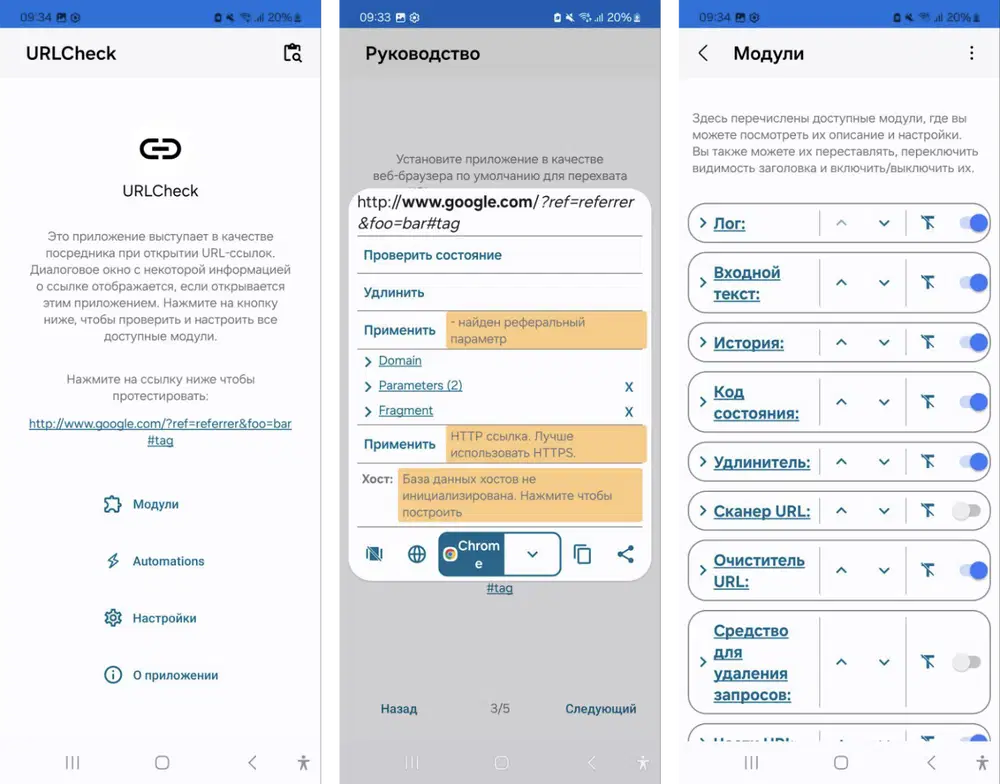 Чтобы использовать URLCheck, нужно установить его как браузер по умолчанию на устройстве. После этого все открываемые ссылки будут сначала запускаться через приложение, которое отобразит информацию о ссылке и предложит различные варианты действий.