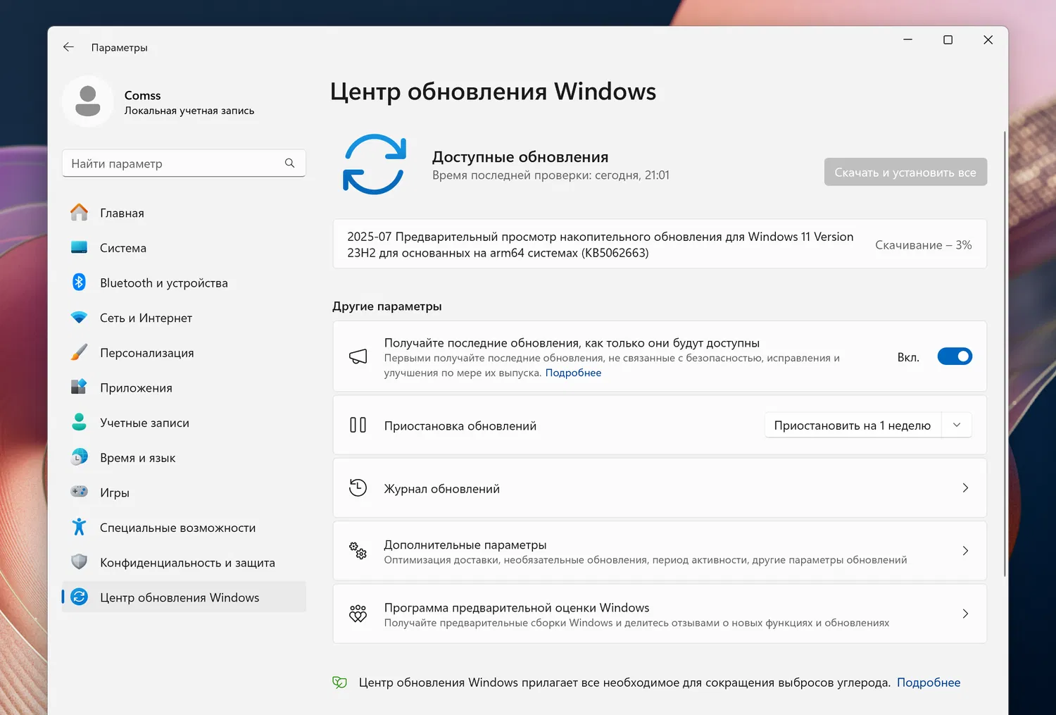 Примечание. Чтобы предварительные обновления устанавливались автоматически, включите опцию Получайте последние обновления, как только они будут доступны в меню Параметры > Центр обновления Windows.