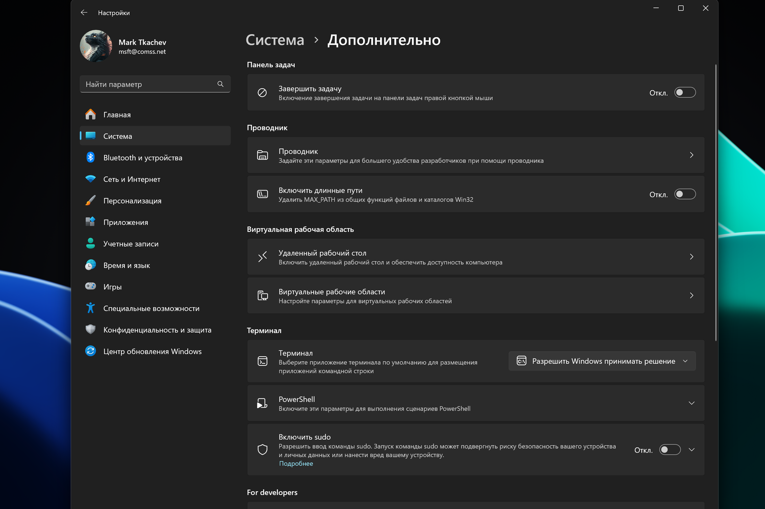 Раздел «Дополнительные настройки Windows» скоро заменит текущий раздел «Для разработчиков» в настройках. В нем появятся функции из закрытого приложения Dev Home — например, включение длинных путей, настройки виртуальных рабочих столов и интеграция исходного кода в Проводник. Все параметры будут разбиты по группам: «Панель задач», «Проводник», «Терминал», «Виртуальные рабочие столы» и другие.