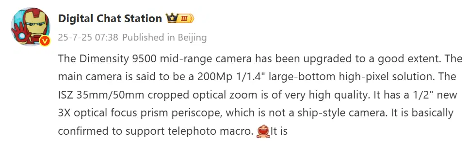 Новая информация от Digital Chat Station указывает на поддержку внутрисенсорного зума с режимами кадрирования 35 мм и 50 мм, что обеспечивает высокое качество при увеличении. Телеобъектив с матрицей 1/2 дюйма оснащён призменной конструкцией, что улучшает стабильность и точность фокусировки. Возможность телемакросъёмки добавляет универсальности, позволяя снимать крупные планы с высоким уровнем детализации.