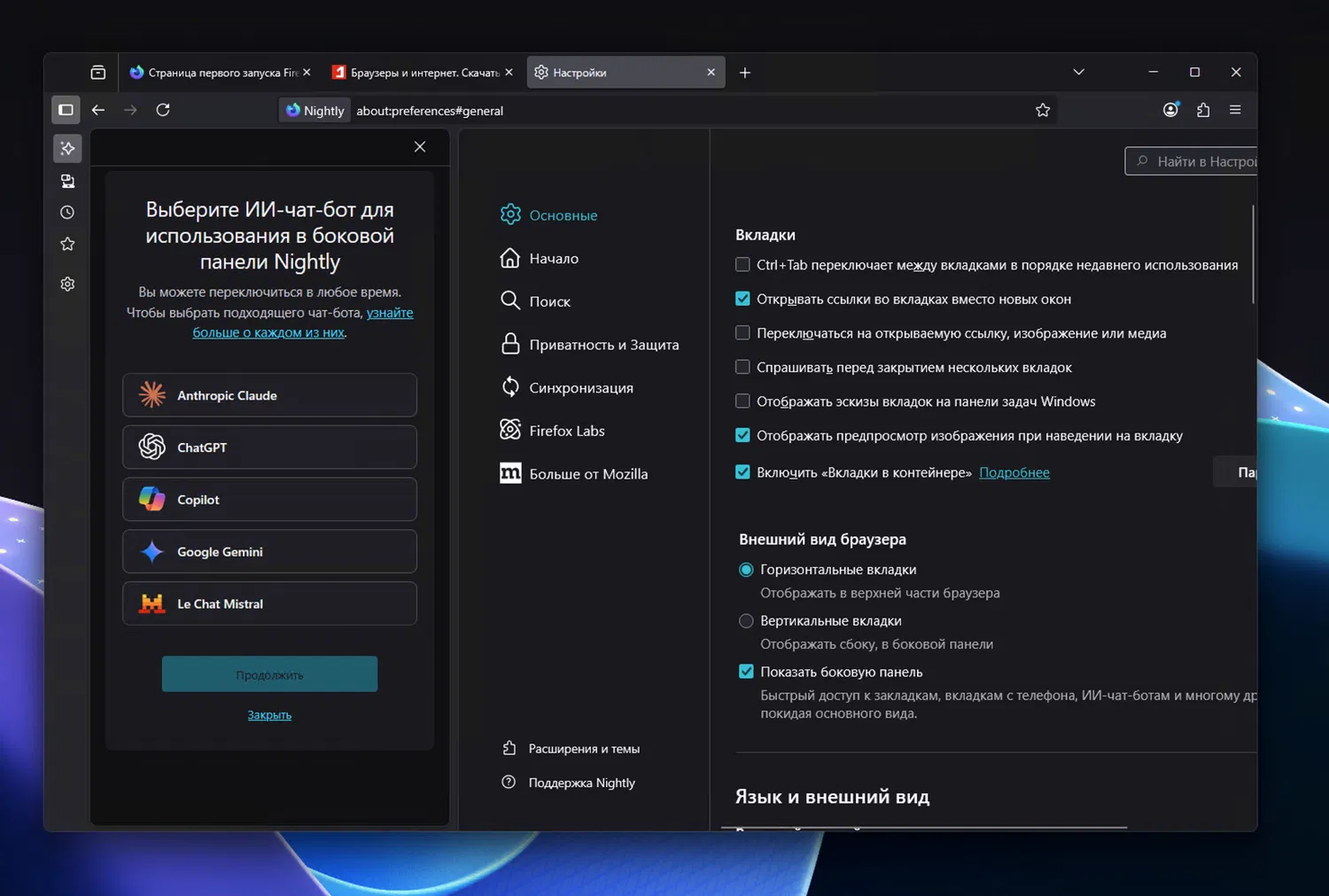 Mozilla тестирует новую функцию в Firefox Nightly — добавление Microsoft Copilot в боковую панель (меню Настройки > Основные > Внешний вид браузера > Показать боковую панель).