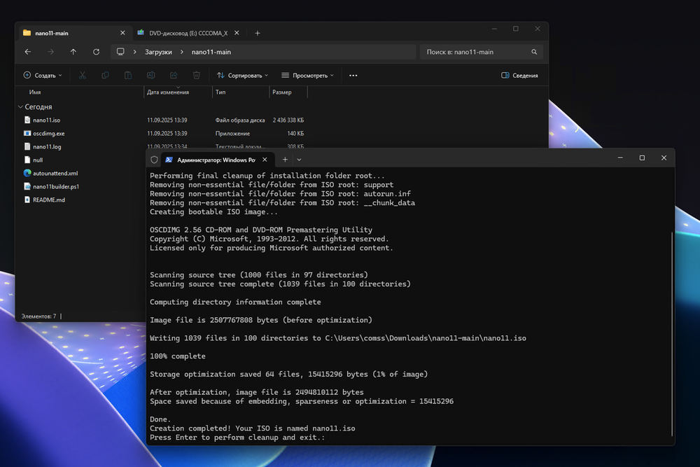 Подобно tiny11 Builder, nano11 использует официальные инструменты Microsoft для модификации исходных образов Windows 11 (в частности, возможности обслуживания образов и работы с пакетами компонентов). Скрипт принимает оригинальный ISO-образ, вырезает указанные наборы функций/пакетов и формирует новый облегчённый образ для установки.