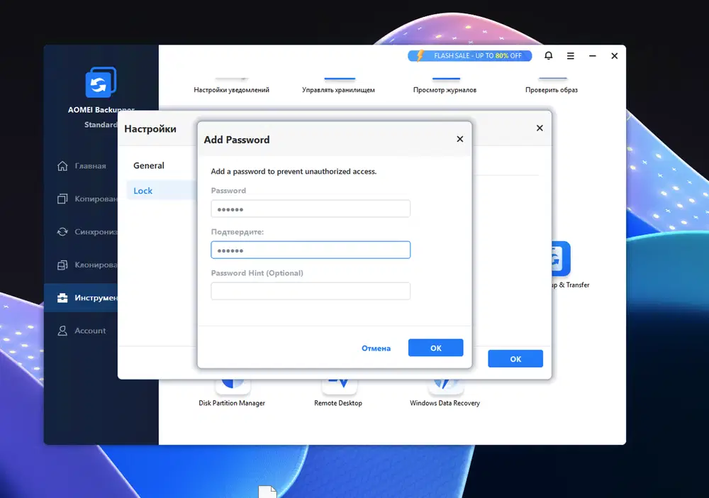 Опция «Lock» (меню Настройки > Lock) позволяет задать пароль, который потребуется вводить при каждом запуске AOMEI Backupper. Это особенно полезно, если за ПК работает несколько человек или требуется дополнительная защита важных данных. Теперь ваши резервные копии и настройки будут доступны только вам.