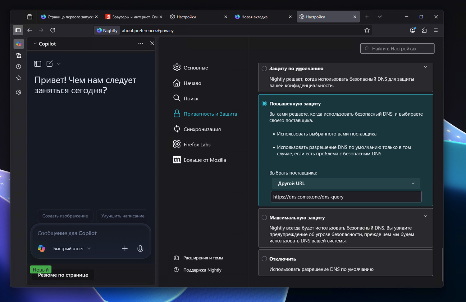 Примечание. Microsoft ограничивает доступ к Copilot в России. Вы можете использовать Comss.one DNS на вашем устройстве. Инструкция по настройке браузера доступна ниже.