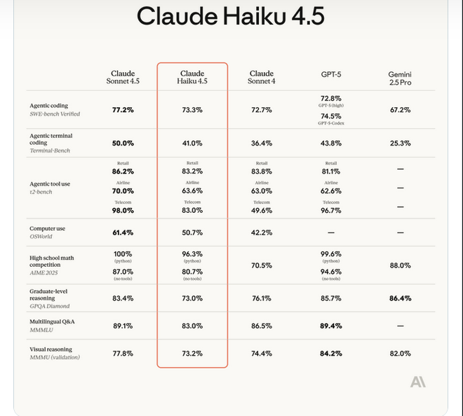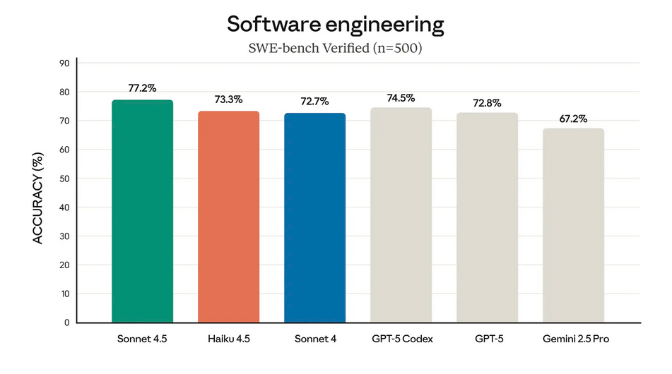 По качеству генерации кода Haiku 4.5 сопоставим с более продвинутой моделью Claude Sonnet 4.5, но работает более чем в два раза быстрее и обходится в три раза дешевле. При этом модель достигает около 90% эффективности Sonnet 4.5 в задачах агентного программирования и превосходит её по скорости отклика, особенно при работе с оркестрацией подагентов и выполнением сложных инструкций.