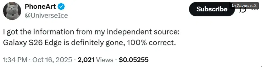 Инсайдер Ice Universe заявил: «Galaxy S26 Edge точно отменён, это 100% верно». Другой известный источник, OnLeaks, подтвердил информацию, сопроводив её комментарием: «Это правда».