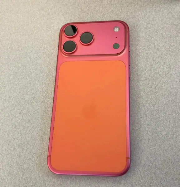 На Reddit появились снимки модели iPhone 17 Pro Max в цвете Cosmic Orange, у которой алюминиевый корпус приобрёл розовые или золотисто-розовые оттенки. При этом матовое стекло в центральной части сохраняет исходный цвет.