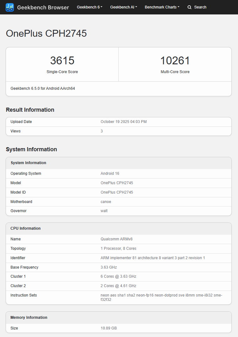 Глобальная версия OnePlus 15 оснащена процессором Qualcomm Snapdragon 8 Elite Gen 5 и стартует с 12 ГБ оперативной памяти. Geekbench подтверждает именно такую конфигурацию. По аналогии с предыдущими моделями, ожидается и версия с увеличенным объемом памяти — не менее 16 ГБ.