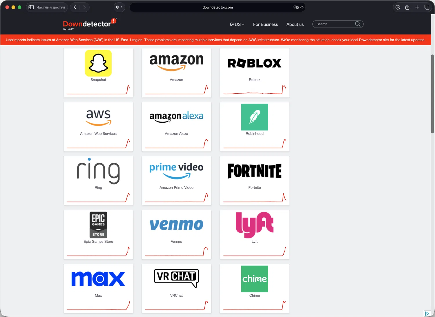 - Проблемы начались в регионе US-EAST-1 (Северная Виргиния), где сосредоточена большая часть облачных серверов AWS. Именно здесь впервые зафиксированы «повышенные задержки и ошибки» в работе сервисов.