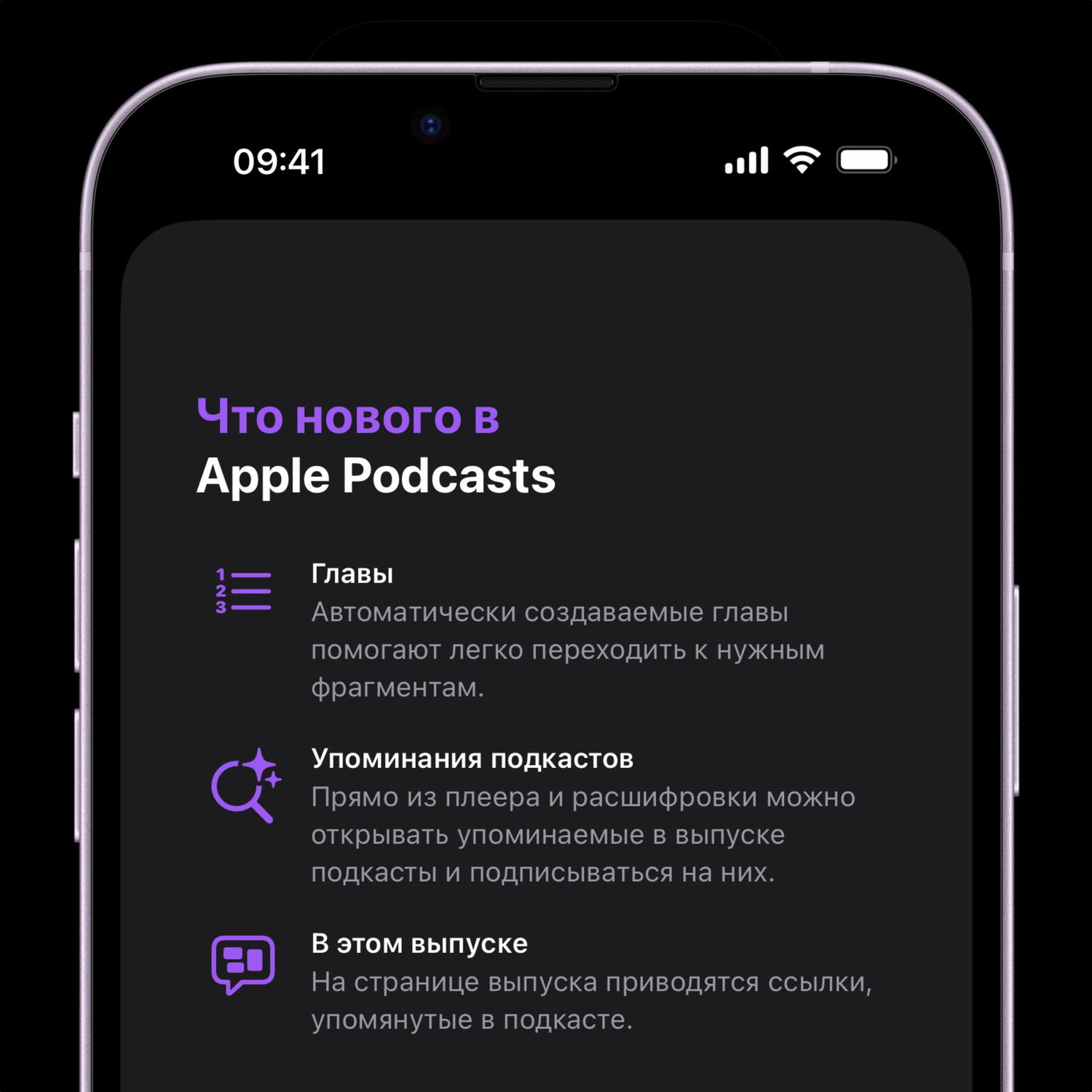 - Появилась возможность видеть контент, связанный с временными метками: ссылки на Apple Music, Apple News, другие подкасты или материалы Apple TV.