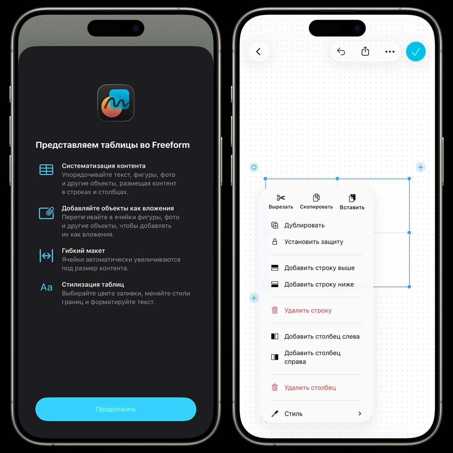 В Freeform теперь можно добавлять таблицы с настраиваемыми ячейками. Пользователь может менять размер, цвет фона, добавлять содержимое, а также вставлять или удалять сразу несколько строк и столбцов. Это делает приложение удобнее для командной работы и планирования.