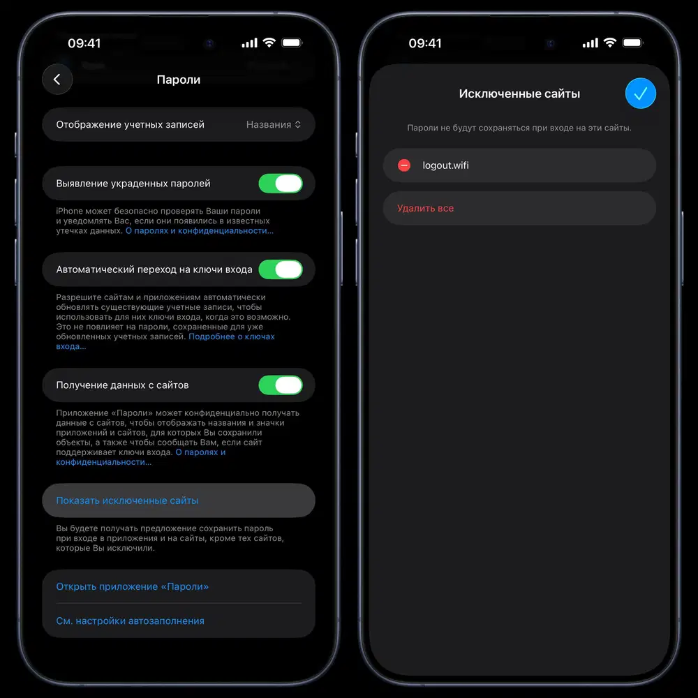 - В настройках приложения «Пароли» добавлен список исключённых сайтов, на которых система не будет предлагать сохранять учётные данные.