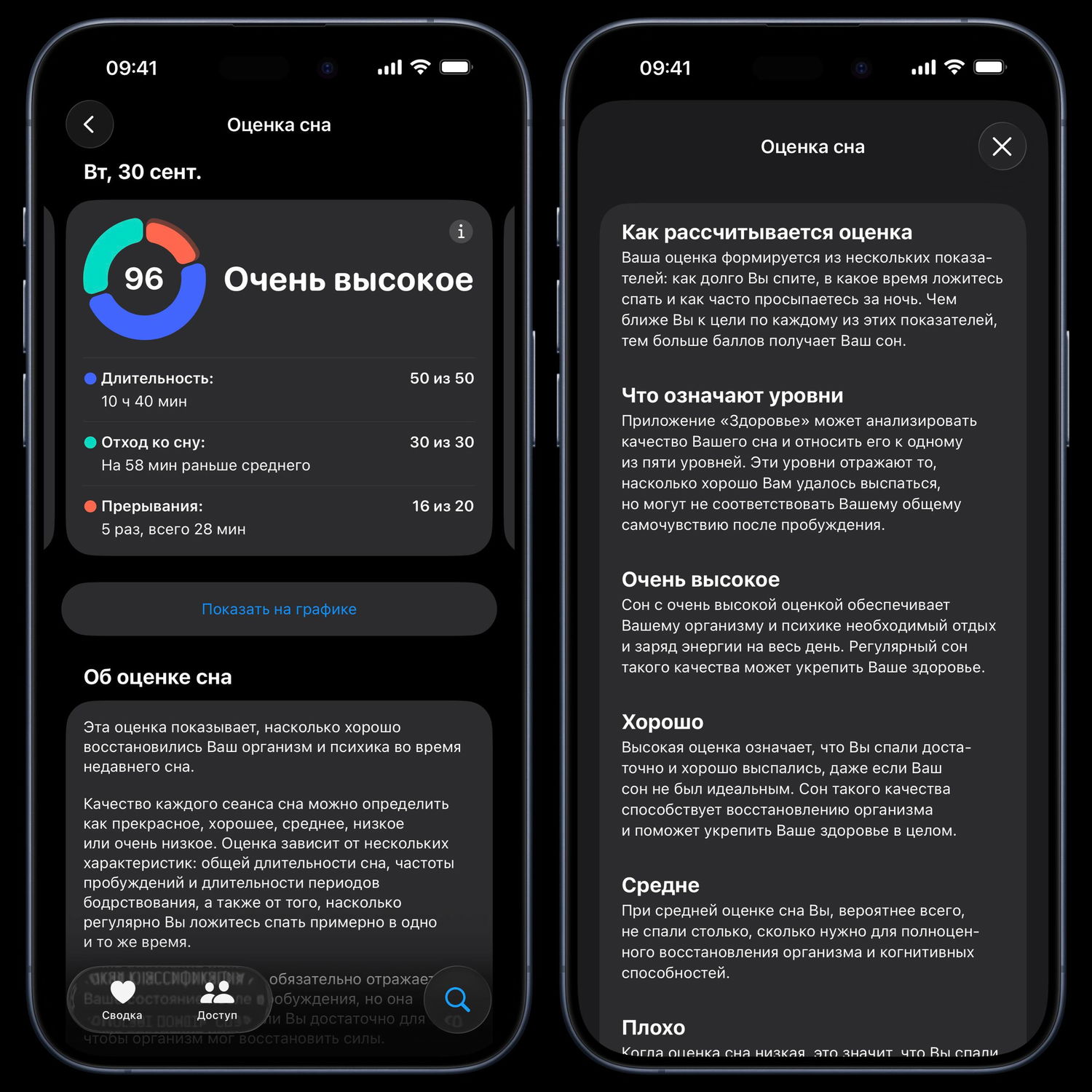 Приложение «Здоровье» получило обновлённую систему оценки сна. Пересмотрены диапазоны значений и визуализация данных в разделе Оценка сна — теперь градации более точные и понятные:
