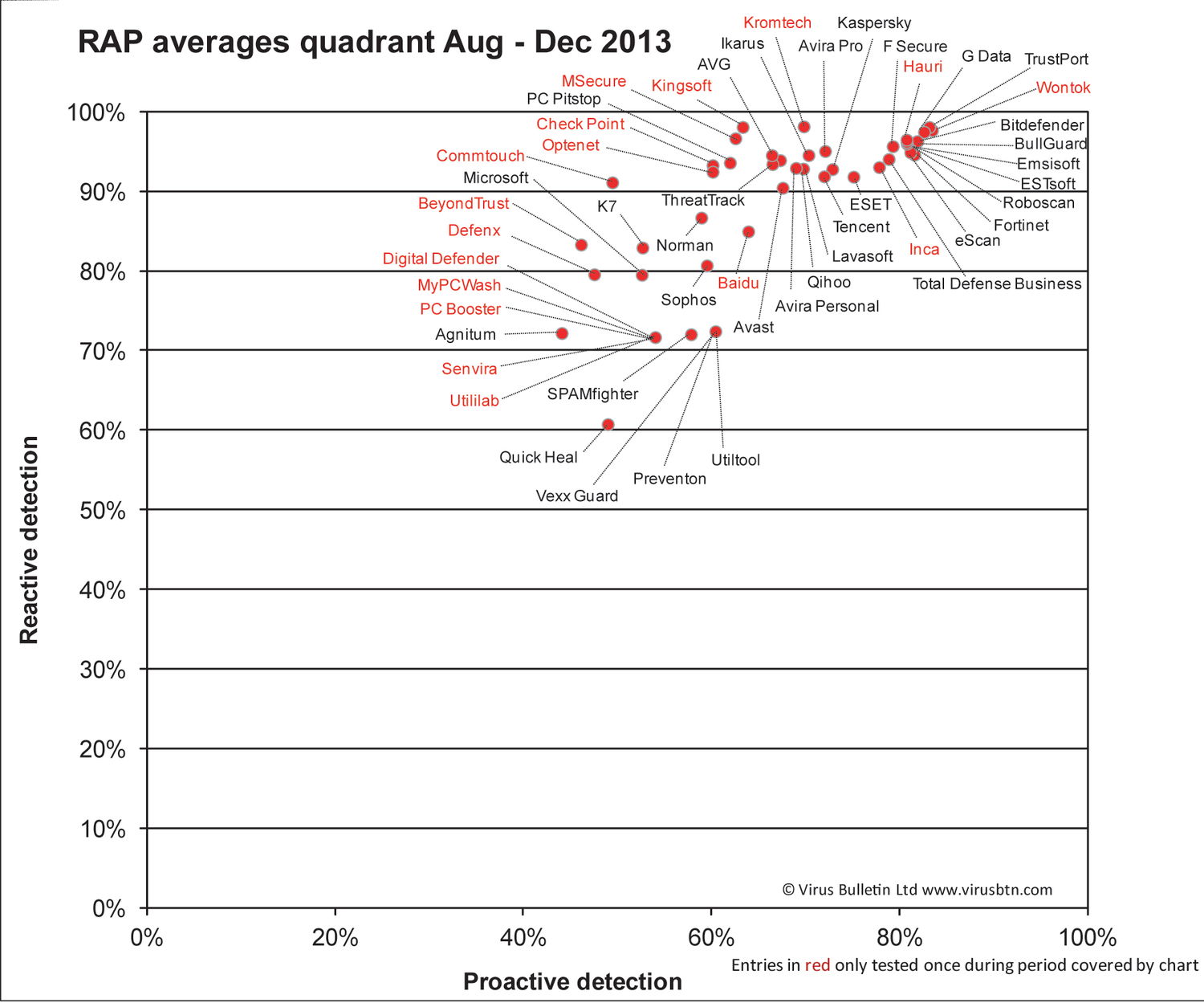 Тестирование проводилось на разных наборах вирусов, и на основании полученных результатов высчитывался индекс RAP (Reactive and Proactive), характеризующий уровень детектирования как реактивными, так и проактивными методами. Итоги тестирования показывают, насколько оперативно производитель реагирует на появление новых угроз, а также насколько хорошо антивирус обнаруживает неизвестные разработчикам угрозы.