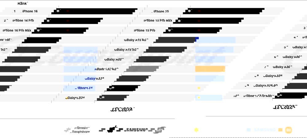Для сравнения, в аналогичном отчете за прошлый год, хотя Apple и Samsung также доминировали, в список смог пробиться Redmi 13C 4G. В текущем периоде наблюдается полное исключение других производителей.
