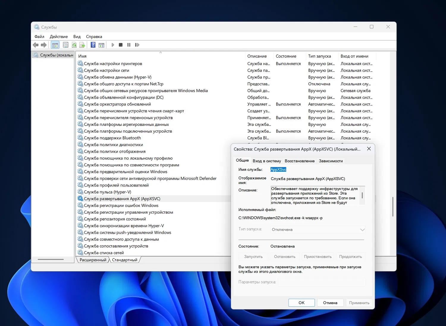 Отключение службы AppXSvc через реестр (не рекомендуется)