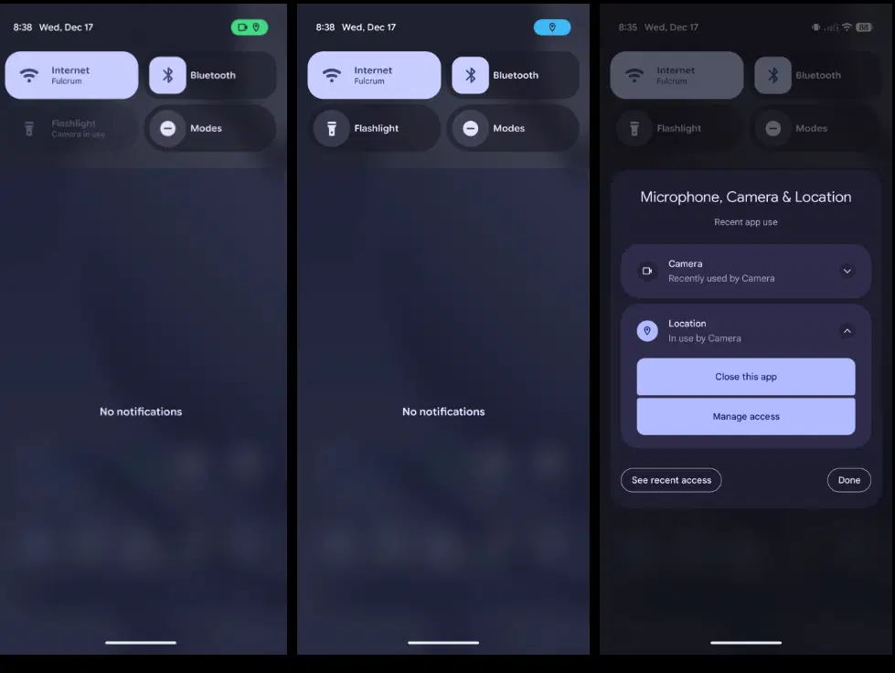 В Android 16 QPR3 Beta 1 реализовано расширение системы визуальных уведомлений о работе датчиков. Начиная с Android 12, пользователи могли видеть зеленую точку в углу экрана, когда приложения использовали камеру или микрофон. Теперь в систему добавлен синий индикатор, который сигнализирует о доступе программ к местоположению устройства.