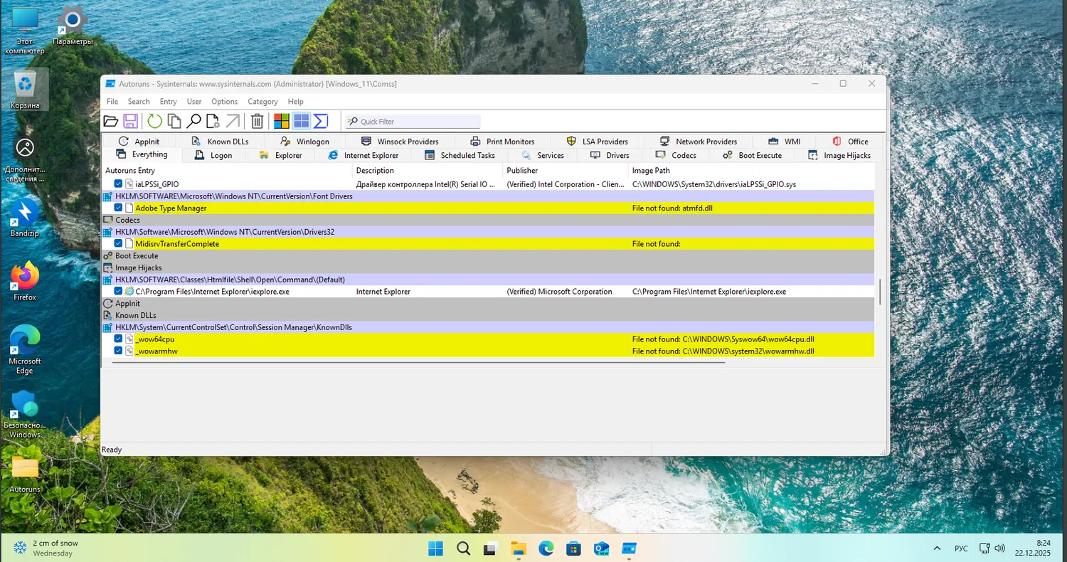 Стандартный Диспетчер задач позволяет увидеть лишь часть процессов, запускаемых при старте системы. Для более глубокого анализа была использована утилита Autoruns из пакета Sysinternals Suite, которая мгновенно выявила сотни расположений в реестре и системных перехватчиков. Инструмент подсветил желтым пункты с пометкой File not found - это записи реестра, указывающие на файлы, удаленные несколько лет назад.