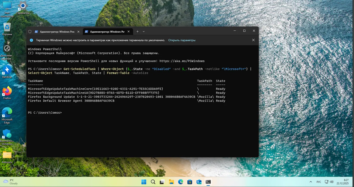 Запланированные задачи Windows часто остаются вне поля зрения пользователей из-за сложного интерфейса штатного Планировщика. Использование PowerShell позволило получить четкий и структурированный список всех активных задач. Для этого применялась команда: