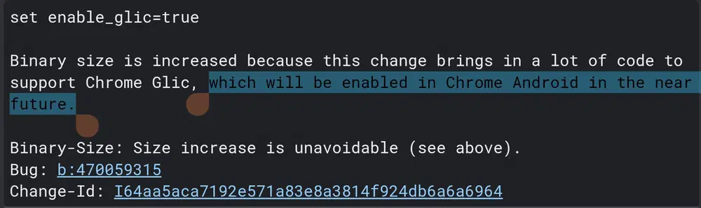 Размер бинарного файла увеличился, потому что это изменение добавляет большое количество кода для поддержки Chrome Glic, который будет включен в Chrome для Android в ближайшем будущем.