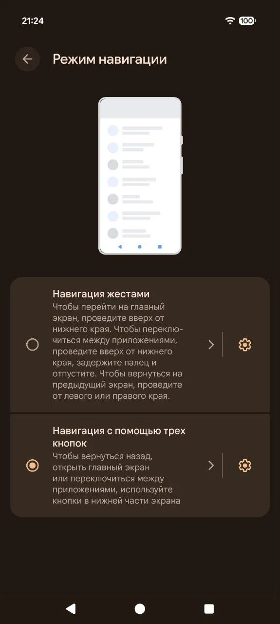 Включить новую схему можно в разделе Параметры > Система > Режим навигации, выбрав «Навигация с помощью трех кнопок» и открыв дополнительные настройки.
