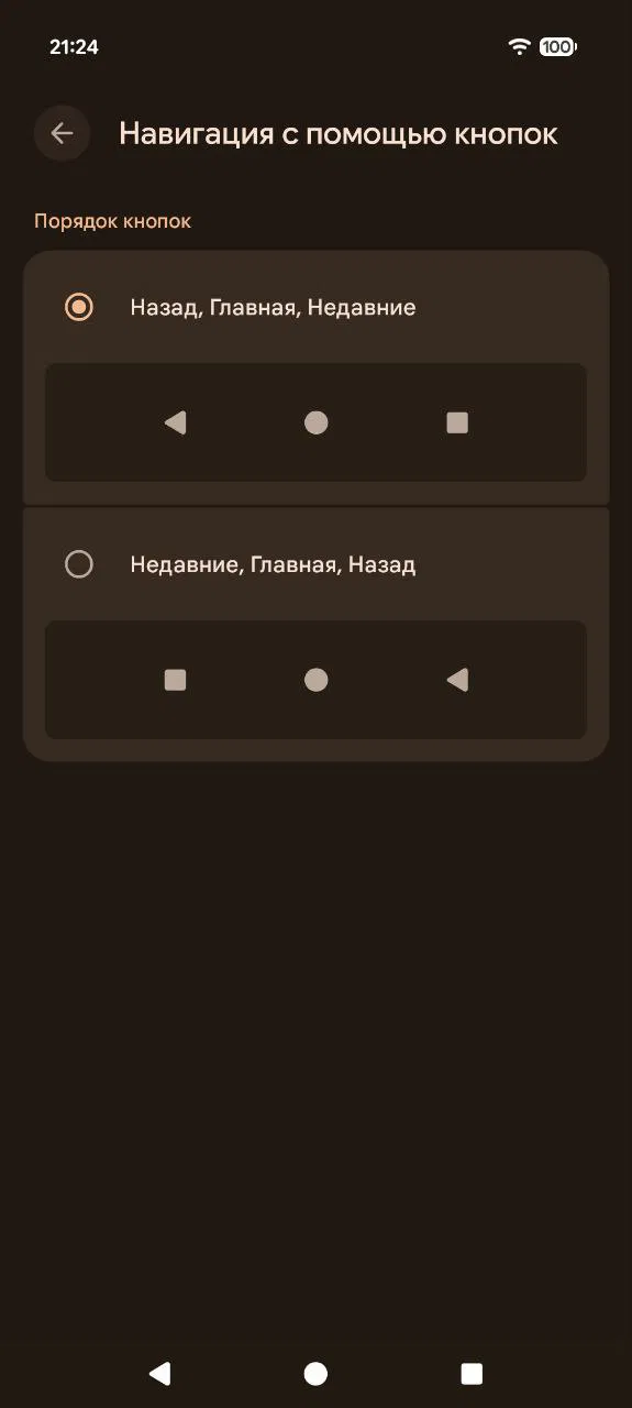 Помимо стандартной схемы Pixel (Назад, Главная, Недавние), добавлен альтернативный порядок, популяризированный смартфонами Samsung: кнопка «Назад» располагается справа, а «Недавние» — слева.