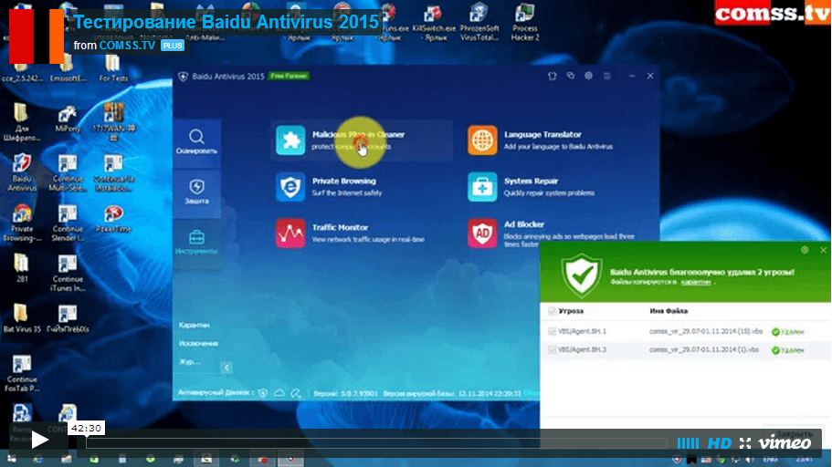 Тестирование бесплатного антивируса Baidu Antivirus 2015. Проверка уровня обнаружения, защиты от фишинга, самозащиты и проактивной защиты при запуске неизвестных угроз и bat-скриптов