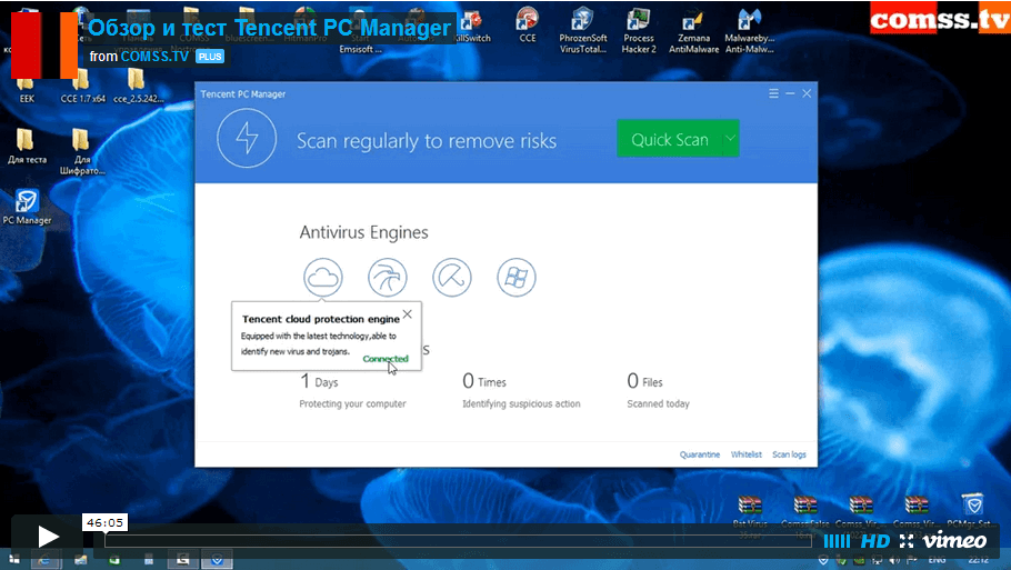 Tencent PC Manager - бесплатный антивирус с облачной, проактивной и локальной сигнатурной защитой в реальном времени, использующий антивирусные движки Tencent и Avira. Веб-антивирус защищает от вредоносных сайтов и загрузок, а также фишинга.