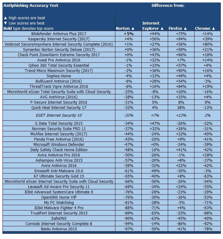 В тесте антифишинга результат оказался плачевным. ESET уступил Norton 33 процентных пункта, хотя все-равно превзошел по эффективности встроенные фильтры всех трех браузеров.