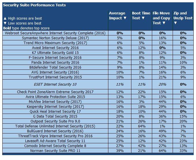 ESET NOD32 Internet Security является новым продуктом и его некорректно сравнивать с прошлогодними версиями других продуктов ESET. Тем не менее, прошлая версия ESET NOD32 Smart Security серьезно замедлили производительность системы - 39 процентов по результатам трех тестов против 11 процентов у ESET NOD32 Internet Security.
