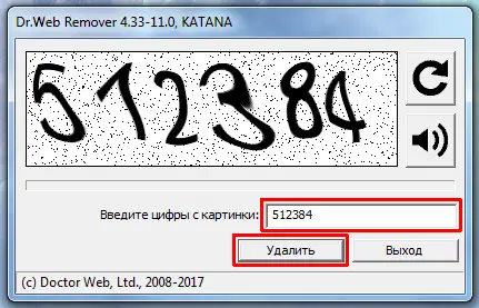 Перед запуском утилиты, закройте все программы и открытые окна. Запустите утилиту и введите цифры, указанные в окне, в специальное поле. Затем, нажмите кнопку "Удалить" и дождитесь завершения работы утилиты: