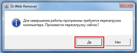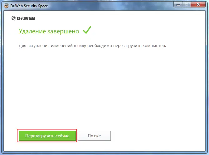 После перезагрузки, все продукты Доктор Веб будут полностью удалены с вашего компьютера.