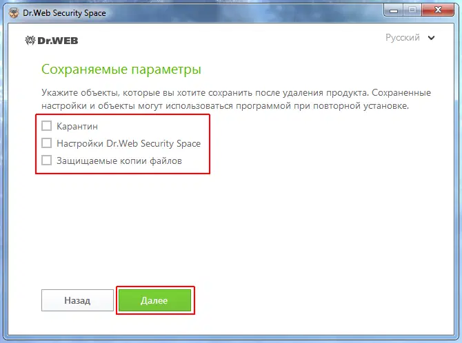 Во время удаления, снимите отметки с пунктов, которые не нужно сохранять и нажмите "Далее":